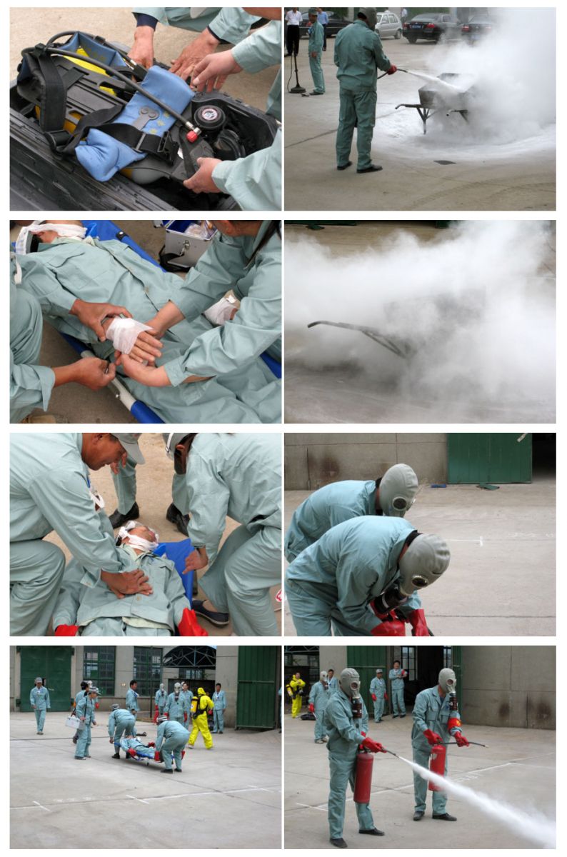 由于生產(chǎn)所需原料有易燃,含毒的特性,我公司定期舉行消防,以及急救的演習。演習內(nèi)容包括對起火源的處理,人員的疏散,火勢控制,中毒人員的急救及轉(zhuǎn)移等。