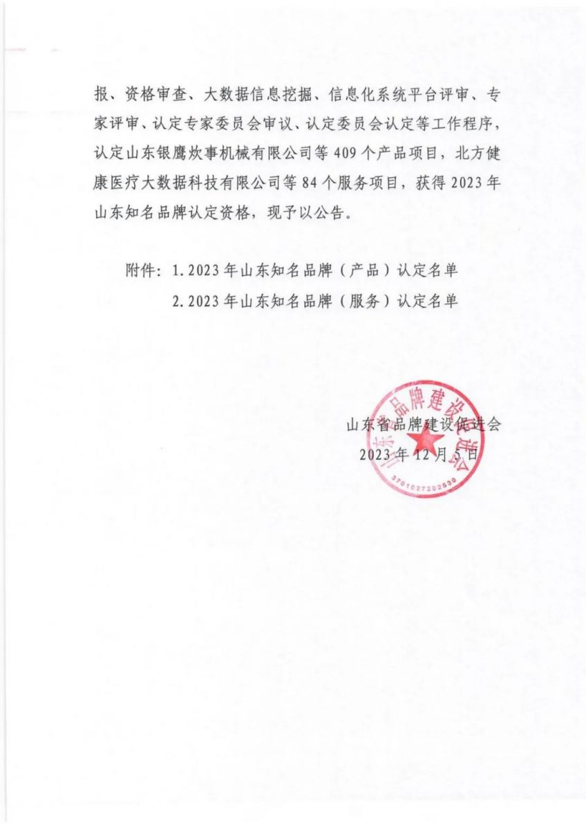 關于發布2023年山東知名品牌認定名單的公告